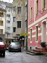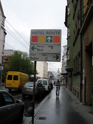 从火车站出来,冷冷的阴沉的天飘着雨,看起来很不妙。我订的小旅馆Pension Stoi在Salurnerstrasse,据说离火车站只有200米。果然,过了马路,面前的这条街就是Salurnerstrasse。走了几十米,就看见Pension Stoi的标志,又走了不少路,却没找到,再绕回来,才发现它是躲在Salurnerstrasse左手边向后伸进去的一条小巷,所以往前走时很容易错过。Pension Stoi有一种类似青年旅社的感觉,似乎有不少房间,管理人员也很冷淡,而且说不包早饭。好在房间还行,反正就住一晚,最要紧是位置方便,而这里离火车站真的真的很近。