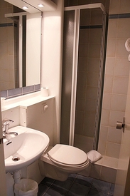 酒店位于勒瓦卢瓦 佩雷Levallois Perret这区,靠近塞纳-马恩省河畔讷伊,地铁3号线 Anatole France Station。酒店外观不大,不过里面却有54间房间,似乎很多欧洲的饭店都是这样,门面小小的但是底部很深呢,与其说这是间二星级的饭店,Hotel Campanile没有太多附属的设施,简单干净。浴室,一样维持小而精简的特色,也满干净的,不过有点老旧,天花板的木板还有些剥落,这都还可以接受 最讨厌的还是吹风机这件事情,整个饭店居然只有四只在柜台外借,而且不能借很久,要借真的要看运气。