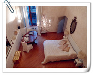 酒店就是这座在外面看不起眼儿的大宅。整个宅子静悄悄的,好像除了我们没别人住。之前订了两个房间,接待的姑娘不好意思地告诉我们其中一个房间的水管坏了,询问我们四个人是否可以住在一个大套房里。或是帮我们再找一间旁边的酒店(又来啦。。。 )。进到套房一看,我们就决定住下了。是个带阁楼的大房间,宽敞明亮。 从阁楼里看整个房间。据房主说,这个宅子有几百年的历史,是属于当时旺族美第奇家族的。看到照片右边床头上那个也有着几百年历史的铜镜了?我对它很感兴趣,有事没事就对着它琢磨,虽然时间久远锈迹斑斑但还可以隐约看到自己的影像,好好磨磨还可以继续用。套房外面的起居室和厨房我们可以随便使用。这是房间外起居室的样子,还有中文书。 房主给了我们一把钥匙。晚归只能自己开门,当天半夜回来的时候,经过了大铜门,大铁门,上了一段黑乎乎的楼梯,打开走廊灯,又绕了几道弯儿经过起居室走廊才进到房间里。整幢楼静得掉根针都能听见,如果人少住在这里真得会怕。 大宅酒店里是不可能有早餐的,拿着酒店给的早餐券去旁边一个叫ZAZA的小餐馆里吃早餐。别看餐馆布置的像山顶洞,提供的饭菜却精致可口。前几天看到一个关于推荐意大利餐厅的微博,还有这家。