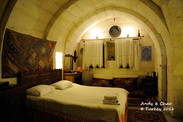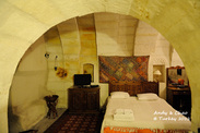 Canyon位置很好,算是半山腰,可怜半拖半抱着沉重的拉杆行李箱,好容易才爬上了Canyon View的阶梯,。Canyon就在著名的K家(Kelebek Hotel)旁边,而K家那个夸张的露台游泳池(卡帕地区缺水,这里的高级酒店也少有设置泳池)也和Canyon的庭院紧密相连,毫无阻隔,使得Canyon的客人可以直接走过去使用这些设施,呵呵,我喜欢这种毫不以邻为壑、乡里乡亲的感觉。Canyon家拥有无敌景观大露台。在格雷梅,要是你的酒店没有大露台,那简直都不好意思开口招揽客人。 与K家的做大不同,Canyon是一间家庭经营式的小客栈,由Unsal两兄弟及他们各自的老婆经营。除开旅店以外,哥哥赛义德(Seyit)还是热气球飞行员,弟弟穆斯塔法(Mustafa)则当带团导游,总之都是靠山吃山为世界各地游客们服务的。客栈本身原来是一家人的住宅,共有6个房间,分别是主人的夏屋、冬屋以及马厩、鸽子房、储藏室和一间酿酒屋,如今全都改建成洞穴房间接待游客。我们4个人入住了最大的“马厩”套间,共有里外两个房间、两个卫浴间,三张单人床和一张双人床,可以住5个人呢,每日价格270里拉(约合860元)。 住在这样有几百年历史的山洞里,虽然不至于发思古之幽情,虽然头顶的石洞还会在你未察觉间洒下一层薄薄的粉尘(不知道别的洞穴房间有没有这种现象),但总的来说,感觉还是蛮浪漫的。
