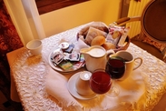 B&B就是Breakfast&Bed的意思,这家酒店在Booking上评分高达9.5,基本上只有少数天价的豪华酒店可以媲美。一开始的印象不是很好,难找的小小门脸,需要按门铃才有人来应的门。不过门开之后,是一个和蔼的意大利老太太,窄窄的楼梯,老太太身手矫健的就提着我们最重的箱子上去了。虽然外表不起眼,但是房间内的布置很温馨,各种布置都体现出一种细心而有别于整齐化一的商业化酒店装修,墙上悬挂着各种风格的油画,桌面上支着蜡烛,书桌上威尼斯本地风格的玻璃装饰品,几种不同特色的台灯,最让人吃惊的是,在门口有一个阅读架,上面有一本套着外壳的书,原本以为是装饰品,仔细打开一看,原来是一本详细介绍圣马可教堂绘画以及其他艺术的画册,真的有一点家居的感觉。感觉最好的是,老太太特意拿出一个热水壶问我们是否需要,估计是了解到中国人有喝热水的习惯,这一点待遇在高档酒店都没有享受过,果然是细致入微的服务,不愧高高的评分。不过就是上网信号不太好,不知明天早餐如何。