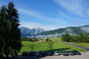 Hotel-Restaurant Gosauerhof 戈绍霍夫酒店,双人间,含早餐,EUR212/两晚 地址:Gosau 632,Gosau,4824 联系方式:+43 6136 8229 其实在制定行程的时候,我们在戈绍住的两晚原计划是住在哈尔施塔特的,但无奈心仪的酒店都非常紧张,要不就是不能连住两晚,要不就是只有一间房,而我们需要两间,所以才选了戈绍,想着自驾,开车很方便。其实要不是非要住在小镇的话,我觉得我的这种安排是不错的,首先戈绍景色非常不错,我选的酒店位置绝佳,环境清幽,适合度假,而价格也只是哈尔施塔特酒店的一半到三分之二的样子;其次,戈绍开车到哈尔施塔特最多只要十分钟,到萨尔茨卡默古特湖区也只要40分钟,非常方便,还能欣赏沿途风景,当然如果不是自驾,那就不推荐了。 戈绍霍夫酒店,是一家家庭旅馆,姐妹二人经营,两人大概都五十多岁,姐姐负责酒店的大小事务,妹妹负责餐厅并且是餐厅的主厨。这个小镇超级安静,只有一条主要公路经过,路上看不到太多车,行人更是少,周围绿色的山坡在夕阳的映衬下,简直太美了。 办理入住时,姐姐告诉我们周围没什么吃饭的地方,如果需要用餐,酒店餐厅就可以提供,只是餐厅的营业时间较短,晚上的6点到7点半,记得在booking订房的时候,有人评论酒店的晚餐非常不错,于是我们愉快的决定晚上就在酒店吃饭。 大概六点过,我们下楼到餐厅,已经有大概四五桌客人在用餐了,翻开餐单,第一页是妹妹写给客人们的,妹妹叫Annie,大概就是,餐厅的食材都是取自于周边,例如戈绍湖的鱼,附近农场的鸡,蔬菜是她们自己种的,非常新鲜。菜品都是Annie自己研究搭配的,并且只有她自己给大家做饭,所以可能时间会稍长,请大家耐心等待。餐单只有三页,每一种肉类只有一种做法,于是蜜点了一条鱼,蜜老公点了组合烧烤,老公点了小牛肉,而我点了火鸡肉沙拉。 晚餐的味道真心不错,我们都吃的很满足,晚餐花费65欧。 转天到餐厅吃早饭,麦片、果汁、面包、火腿、水果,种类还可以,只是…是这里的生态环境太好了吗,苍蝇有点多,我拿了吃的放在桌上再去拿果汁,回来时,苍蝇已经在我盘子里的食物上大快朵颐了….所以这个酒店的餐厅真的是什么都好,就是苍蝇有点多。 这个酒店真的很推荐,景观好,老板人热情,服务周到,房间也非常舒服。看看这周围的美景,如果纯粹的度假,每天起来周围转转发发呆,也挺好。