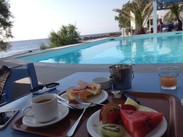 一个人一晚的花费也不过是37.5欧元,还包括私人海滩和免费早餐。第一次尝试希腊的酸奶,好吃到爆灯!连不爱喝酸奶的某人,每天早上都要来一大碗。自助早餐提供蜂蜜和各种果酱,我喜欢蜂蜜拌酸奶,口感顺滑香浓。如果是掏腰包消费,是要4.5欧一份的噢~~