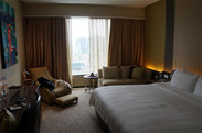 Traders Hotel是我们这一路上住得最贵的一家,1073.87人民币一晚,还不含早餐,早餐要80马币每人,我们没要。可能定贵了,看有的网友说他们公司协议价500多,那还差不多。不过这家宾馆确实好,周边是花园,有慢跑道,房间设施很好,离KLCC又近,吃饭购物都方便。我都选AGODA上评价高的订。 宾馆的RECEPTION在五楼,不知为何手续办得很慢,要排队。等候的时候有服务员给你送小管饮料喝。我当时定的是TWIN BED,不知为何他给换成了KING BED,没听明白。到房间一看,服务员在沙发上给孩子铺了被褥,也行。房间在22层,可惜不是TOWER VIEW。 实际上我们住的Traders Hotel离双塔很近,来回非常方便。在双塔有湖的那面穿过花园,顶多十分钟就到了,而且双塔湖边有到宾馆的免费电瓶车,两分钟就到。如果下雨,从宾馆沿会议中心的大走廊可以不浇雨到KLCC。