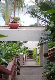 每一处都可以说是一处“景色”,园艺和细节都做得相当到位,房间里是一个超大的床,面朝大海,睡下四个人都没压力啊!!阳台还有椅子可以晒太阳,因为这样的错层,设计虽然很独特,但也很容易走错路,到处都跟迷宫似的,你永远不知道你走在哪一条道上。 其实我很喜欢卫生间的设计细节:Bathroom 是下沉式,平时站着洗澡能很好的解决水会溢出的问题,而且底部装满水就能变成一个大浴缸,很实用的设计。bathroom顶部用藤条遮盖,既能起到很好的遮光保留隐私的作用,又能透出自然光,与环境巧妙的融合。