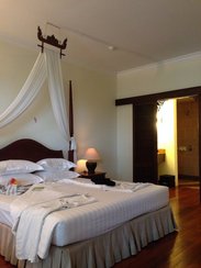 酒店是典型的东南亚热带风格,房间非常大,传统高棉风格装饰,设施很新,由于住宿超过4晚,酒店还送给我们一份双人自助晚餐。这些并不足以给我留下这么深刻的印象,更关键的是它家的服务,是我住过的酒店里面最好的。记得我们check-out那天,由于飞机是晚上的,我就试着问前台能否将退房时间延后一点,想不到他们很抱歉地说由于我的那间房后面已经排好了客人,不能延后,但是为了表达歉意,特意为我再开了一间房间,让我们可以呆到晚上再走。