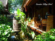 这是一家有着浓郁泰式风情的乡村酒店。宁静的环境、浓密的树丛、半掩的佛像,一踏入酒店大门,一种空灵的感觉铺面而来,一步一佛禅、一步一世界。仿佛步入的不是一家度假村,而是一座位于深山中不出世的寺庙一般。潺潺的流水、细雨中飘绕的绿叶,淡淡的檀香,这一切,都使我无暇顾及酒店的设施和办理入住手续,如饮甘醇,沉醉了! 酒店虽小,却无处不显露出精致与舒适,小小的大堂,精巧的图书馆,蜿蜒曲折的回廊,袖珍而华丽的房间,无不体现着一种别样的美。Sawasdee Village Resort & Spa尽管占地面积不大,泳池只有两个,房间也较少,但它至少拥有60%的绿化,泰国传统服饰打扮的服务员,还有那令人难忘的Thai Spa,我相信会使每一个选择它的游客不虚此行。