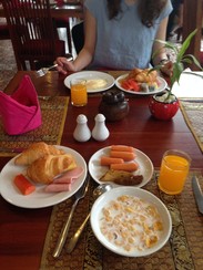 酒店叫做RoyalCrownHotelSiemReap(暹粒皇家皇冠酒店)。酒店共5层,楼顶还有个露台(可以看日出哦)。4层以下有电梯,5层要爬一下。环境挺干净整洁的,服务也很热情。我们差不多晚上快12点才到酒店。还是有迎宾鲜果汁,另外服务员帮你把行李拿到房间,又详细介绍了一下房间各个工具的用法,酒店的情况等。好吧,我这棒槌级的E文水平勉强能听懂大部分。 房间内部环境基本与国内4星级相当,还不错。最大的槽点,WIFI信号不好,经常连不上,时断时续的。 酒店的泳池和自助式早餐,还可以咯。对了,酒店内自带马杀鸡。我俩第一次当地的马杀鸡就是在酒店做的,全身精油17刀/小时,外加5%服务费,前台签单,退房时候结账。