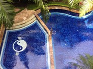 到达巴厘岛已经接近凌晨,选了离机场很近的可以免费接机的酒店,Aston Inn Tuban。双标55刀一天,check out的时候含加床实际收了72刀多,包含免费接机,性价比不错。仅仅过渡性住宿,确赶上了本次旅行唯一一次下雨。不过还好,就下了一小会儿~泳池的图案是中国的太极!!