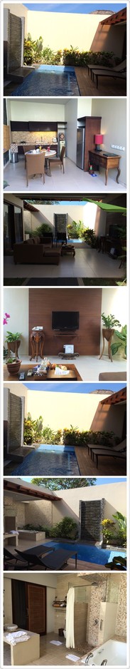 很多人都说来巴厘岛就是来享受酒店的,实在太棒。价格亲民,我们定的酒店在小中心区,叫DESA MUDA VILLAGE,大家可以在地图上找到它并看到地理位置。在地图右中间。这回是独栋的小“别墅”,客厅两边是露天的,洗手间和浴室没有门窗和墙,站在洗手间就能看着客厅旁的迷你泳池。实在太赞。厨房的工具都齐全,还可以自己做饭吃哦!酒店公共泳池目测有两个,一个在房子中间,一个在酒店大堂那。房间内有欢迎水果和小零食,酒店可以送餐到房间。和前面一样,酒店都有安排包车送我们要去的地方。最后面我们下午5点离开的,酒店也安排了包车送我们到机场,实在方便~