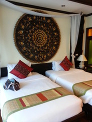 很漂亮很干净很别致的泰北风情的酒店,离周末夜市非常非常近,在一个十字路口边,门面不大,但里面别有洞天。相当的宽敞明亮,唯一的缺点是在主街上有一点点闹。