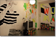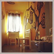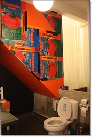 我们房间在3楼,从1楼入口要刷一次感应卡开门,可惜没电梯,30几度高温搬行李真的会飙出一身汗(还好下午有服务生帮我搬将近20kg的大行李箱,看他这样拼命晃上3楼不啰唆双手奉上小费50B)。进房第一眼的感觉有点失望,除了官网上已经看过的2面彩绘,其它墙壁都是小小的黑色涂鸦远看有点脏,地上的隔热铝箔泡棉(不知它的正确名称),被旅行箱轮子刮的都是痕迹还用胶带补起来,踩起来感觉不舒服,赶快穿拖鞋,顿时觉得这间房不值这个房价。