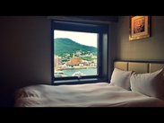 我要去的是LA VISTA HOTEL,是因为听说它的景观特美。我是在jalan网预订的,很方便,大约1200RMB一晚,虽然小贵一点,但,值!! 酒店的顶楼是露天风吕,那个只有5摄氏度的晚上,我第一次在这样充满画意的城市里,泡一个舒适的温泉,暖暖的,似乎可以让我忘记一切。回想起这么多年以来,盼望游日的我,真的很感恩。我就是如此的多愁。好好地睡了一觉,可能心情确实兴奋,我5点半的时候醒来了,朦胧地张开眼睛,哇,以为自己在梦境里呢。记得睡前你说,不用放下窗帘睡了,第二天就让阳光叫醒我们吧。阳光虽然还没到来,所以,最美的一幕先来了,这是坐在床上的我拍的,一幅油画似的,这是不能忘怀的清晨。还有在身边的你,因熟睡而发出的呼吸声,我,能在这空间里,幸福满溢。