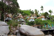 缇维曼度假村离码头大概5公里,修建在涛岛西北部的半山上,乘坐酒店免费接送的车上山,一路颠簸,也算过了一把越野车的瘾。穿过茂密的树丛,站在酒店的大堂,依山面海,无边美景令人陶醉。酒店的客房不多,每个都是独立的,隐藏在热带灌木中,根本不需要窗帘。每个客房都有面海的阳台,坐在松软的坐垫上,俯瞰水晶般清澈的海水,落日余晖醉人心脾。夜晚枕着海浪拍打岩石的声音入眠,清晨让海风自然而然把爱人从美梦中唤醒。而我,只需要侧过身来,在你的脸颊印上轻轻的一吻。