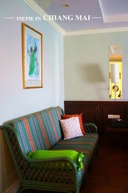 从服务硬件和软件的水平,房间的设计,自助早餐的味道,性价比等各个方面堪称五星。英式设计。身在尼曼路这个高房价的街道里,是飞机起降的必经区域,我们甚至看到过2架战机低飞掠过。尽管如此,平那科经历了一年的清迈旅游热,仍然以优质的服务,低廉的价格成为抢手货,一年过去了,它的口碑在中国游客中传开,现在已经俨然成中国人的地盘了。 小小的大堂,瑕不掩瑜,因为这里全是欧式设计,油画与欧式宫廷家具相陪衬,特别雍容华贵。走上二楼的房间,区域展开,开豁异常。我们的房间在3楼,房间开启后,满是惊喜,房间之大,设施之充足,美丽的油画,典雅的瓷砖。每一个细节都独运匠心。 洗手间有香囊,有手工草香肥皂,卧房有沙发,电视机旁边有DVD放映机和光盘,卧房的开放式起居室里有餐桌和椅子,另一边有厨房,厨房里有微波炉,有各式餐具和茶具,当然还有一个小露台,露台放了一椅子。无论是小小的门锁挂牌,还是三层窗帘布,多方位的收纳箱子和筒子,这里一点也不吝啬布置的质量和力度。在这个房间,我有一种当上公主的感觉。特别是你挂上了“Do not disturb”的牌子,然后出外一天了回来,工作人员会密切关注你何时回到房间,然后电话响起,说要送上第二天的毛巾和饮用水。 说到平那科的自助早餐,估计是聘上了一流的厨师的,食物种类之丰满,特别可口,特别创新。更照顾了中国人的喜好,居然有白粥和油条,每样食物色香味吸引,它是一个几天也尝不完所有食物的自助早餐。