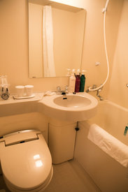 貌似是全国连锁的,不过这家酒店竟然在差不多的位置开了两家,一家在马路的中段,另一家在尽头,所以找的时候要搞清楚是哪家。另外,早上是没有早餐的,所以相比较之下,第一晚住的日式酒店性价比实在太高啦。酒店唯一的优点就是可以泡澡,澡堂位于酒店顶楼。必须带好房卡刷卡进入。第一次在日本泡澡需要学习一下基本知识:那就是必须先洗好淋浴,洗干净了之后才能下池子泡,并且头发要扎起,避免自己的头发掉进澡堂。澡堂的池子分温水池、热水池、冷水池。当地人都是按这个程序来的,我只能承受温水池,并且连温水池我都要适应半天才能下去。