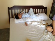 BOOKING上预订,不含早餐,取消预订不退款,双人房1.5大床1050B一间/晚:再续住也是跟BOOKING上订的,是同一价格1050B一间,怎么都不肯优惠,说旁边的那几栋还要1200B呢。 离码头很近,5分钟以内就能走到,站在码头就能看到,在礁石上,走几步路就可以玩水。我们住的是二间房的一栋小别墅,二间房前面有一个相连的大阳台,可以睡吊床,晾衣服。 房间很小,比先前在芭堤雅住的TUNE大一点点,10平米左右,干净,没蚊子,没加床的空间,洗澡的水流很快,沐浴头能取下来;洗手盆的下水很慢。没热水壶没吹风机。 我家小孩五月底才满5岁,所以可以免费。下图是他家的房间,床的左边60CM就是窗户了,右边就是而所门,床前面只有50CM就是落地门了,根本没有空间加床,不过,也许,前台说另外的1200B那种房间能加床吧。