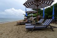 房间很大而且阳台很有特色,在阳台上有小桌子坐着喝东西还可以直接欣赏泳池的景色。这个酒店在海滩上是有自己的沙滩俱乐部的,所以到了以后,报了房间号,人家就给提供免费的毛巾和躺椅。酒店旁边挨着就是一个大超市。早点很好吃,有印尼特色的食品,比如炒饭炒菜什么的。也有西餐的面包奶酪等。