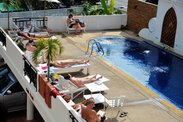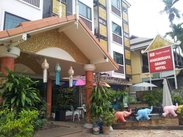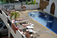 在古城东城墙稍靠南的位置。离塔佩门步行5分钟的距离。清迈古城外,沿着护城河是一条环线,类似于我们的二环,当然比二环小太多了,就当是一环吧,这是清迈一条很繁华的街道,沿着这条路绕古城一周,相当于,我们沿着长安街从王府井走到西单。酒店里面就有租摩托车的地方,旁边一点点就有两个租自行车的地方,护城河对面,就是加油站。这么繁华的位置,我们的酒店里居然还有游泳池!