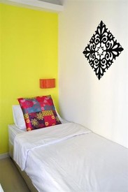 冷气套房。住在405号房,房间在走廊最角落。没电梯。单人小床,照片里,床铺上的抱枕不见了。有小冰箱和电视。新开幕,房间很新,看起来很干净,但是小小一间。单人间没有窗户,只有洗手台上方一扇空气窗,打开也没有视野。大厅有计算机和免费的无线网络,可是房间讯号非常微弱,几乎收不到。在一二楼间有一个阁楼层,里面是电视交谊厅,有软骨头沙发,可在此吹冷气上网。位在华篮蓬火车站对面,地铁站旁边。附近有便利店和小吃店,生活机能方便。步行到中国城,约十分钟。 整体评价(5分满分) 房间指数:2。环境指数:3。地理指数:3。睡眠指数:2。服务指数:2。