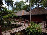 这个度假村坐落于罗博河岸边,之所以订这间酒店,是因为听说罗博河边可以观看到萤火虫。酒店离机场很远,开车走了约1个小时。司机很热情,问我们要不要租车玩,后来才弄明白,司机并不是酒店员工,而是与酒店有协议,后来我们租车钱是直接给司机的,酒店只管通知司机来接,其他都不管。酒店建在一片热带雨林里,里面还在大兴土木,在雨林里开出一条路。酒店的码头,可以租个滑板,或者皮划艇在罗博河上泛舟。本来想在河边钓个鱼,游个泳,因为天气很热,也没有了兴致。 酒店四周非常荒凉,房间还行,但是外出很不方便。我们在酒店附近溜达了下,全是土路,而且要走很远一段土路才能到公路,刚下了雨,路很难走。基本上出行就只能租汽车或摩托车。吃饭只能在酒店的餐厅里吃,不算太贵,基本合理。幸好只是两晚,凑合了