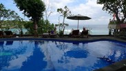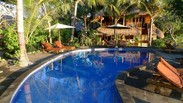 房间里有空调,无冰箱,无电视。开放式卫生间。淋浴、水盆、座便都有墙体隔断。竹筒包裹着水管,没有莲蓬头,水是从顶端流出的,原始的感觉,呵呵。无热水,太热,也无所谓啦。mushroon滩比较清静,coconut滩相对热闹,也是冲浪,及水上一日游的地方。除了villas,他们还有beach屋,独立的复式茅屋,450千卢比。它不是真正意义的建在沙滩上,而是沙滩后的岩石上,性价比更高。酒店泳池旁有两个大大的观景餐台,之间有台阶可以下到公共沙滩。 mushroom区没有夜市,很静。晚饭在花园店的开放式小餐厅解决。印尼炒饭(25千卢比)、印尼烤串饭(30千卢比)、玻璃瓶可乐(10千卢比)。还有一个好处,餐厅,确切地说应该是大号亭子,有花园店区的唯一电视看,42寸液晶。