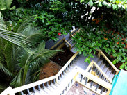 依山势建起的淡绿色房子,一条沿山势而上的石阶,左侧是背包客的单人间,房间价格很实惠,一个单人的风扇房间,也就三四十块钱一晚,欧美的游客居多。我们的房间在最顶层,带空调的三人间,一个十几平米的露台,房间简单而干净,靠在山根下,经常会有许多的红蚂蚁呢!