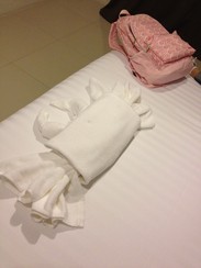 过夜的机场酒店大多都集中于一条街上。酒店提供的免费接机服务是派专车来的,到机场以后打电话给酒店,酒店才派车过来,不过等候时间很短。办完手机卡就打电话过去,大约五分钟车就到了。这里小小失算了,大家引以为戒。因为蝇头小利,反而多花了钱。我们本打算蹭车然后Walk-in,以防万一,所以4个人只预订了1间酒店。没想到半夜酒店都是专车接送,多出2位只能上车并付接送费。而且订房时酒店规定有写最多可住2人,半夜到店叫醒了酒店服务人员,他们当然不同意4人同住1间。最后经协商,支付多2人的接送费了事。 因为晚上灯光很弱,天黑以后walk-in的可能性很小,因为不好找。不是想象中一条街两面开的情形。而且walk-in价格比agoda预订贵了将近一倍。所以还是老老实实提前预订为好。 我们住的酒店是鸟巢精品度假村 (Nest Boutique Resort) ,价格都列在墙上了,agoda 预订房间价格是24USD,到店后多2人多付了700泰铢。 房间很干净,设施比较简单。床上有毛巾折的螃蟹。很有爱。