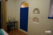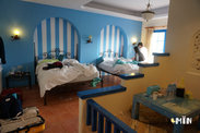 腊风情民宿在垦丁文化巷内,背靠垦丁大街,闹中取静。一幢四层楼房犹如巨大的白色奶油蛋糕,在阳光下闪闪发光,在一排的民宿中显得格外抢眼。这是一对半百老夫妻,凭着一股对地中海的向往,不惜舟车劳累,千里迢迢远赴欧洲各国访视,历经三年,造价上百万,打造的浓郁希腊风情民宿。 民宿的一楼布置清新而简约,有着强烈的地中海特色。墙面被漆成纯白色,镶嵌着拱形的天蓝色门窗,海浪般起伏的装饰墙摆着各种海洋气息的贝壳,小帆船。暗红方砖彻成的壁炉,色彩斑斓的马赛克拼成的海浪地板,黑白镶拼的台阶,都让我们惊叹连连。