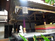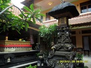 海关收了50美金,出去后与来接我们的旅馆的人接上头、ATM取现,然后很快到了旅馆,check-in,巴厘岛的BOOKING预定不提前收费,要到了后一次性缴纳费用,我从BOOKING上搜的位于库塔的小旅馆名叫“彭杜克登羽民宿Pondok DenAyu Homestay ”,2晚IDR 330,000 含早,合RMB 164。 进了房间,很大,设施也简单,有空调。放好行李,沿小胡同出去边上有一家小饭馆,随便点了2份印尼餐IDR 41,000,就是米饭+炸鱼,味道和中国饭差不多,区别只在调料汁上。 关于这家旅馆,以后的事实证明了“一分钱一分货”的真理,早餐像是喂鸟那样少——只有2片三角形的带馅面包、2只小香蕉、2杯咖啡/茶,压根吃不饱。而且位置太偏,必须旅馆的人去机场接才能顺利抵达,不然自己找不到的,车费太贵IDR 100,000,最不能忍受的是房间的浴室无热水洗澡,幸好只有2晚。 不过这个小旅馆也有优点,他的庭院虽小却很有巴厘岛特色,每个房间由装饰华丽的穿廊连接着,进门应该是先将鞋子脱在廊下再赤脚仅房间的,不过我们还是习惯于穿鞋在屋里活动。院子中间是个有高台的亭子,似乎印度教的地方都有这样的亭子,还有个顶着黑色茅草的小塔,塔旁是一个小男孩石像喷泉,男孩握着自己的小鸡鸡撒尿呢,撒出的细水注入底座的缸内。