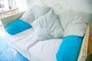 青年旅社,地中海风格,订的三人间,有阳台,去三人间的途中会经过六人间。离火车站不远,走几步路就是加勒的城墙和海边