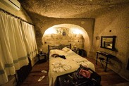 在格雷梅镇住的是Travellers' Cave Hotel,65欧每晚。注意是Hotel, 不是Pension。Travellers' Cave Pension就是另外一家背包客的旅馆了。我们住的旅馆在格雷梅镇边上的小山坡上,我们的房间几乎在最上面,可以俯看整个小镇和周边的风景。每天早上6点半到7点会有50多个热气球从我们头顶近距离飞过,非常壮观。房间是石头彻的,很有洞穴的感觉。山区温差大,晚上有暖气,不怕冷。从酒店到小镇有捷径可走,很近。带着行李的话,打个电话酒店会免费来接。另外,酒店推荐的一日游和气球游都很好,钱统一在结帐的时候付给酒店,十分方便。一日游是Hiro Travel Agent的,热气球是Butterfly公司的。大概因为我们住了四晚,结帐时店主还送了一瓶当地产的卡巴多西亚的红酒,后来我们知道这酒在土耳其还挺有名的。