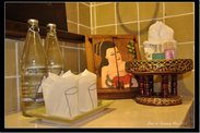 从机场到CHIANG THAI HOUSE不过是20分钟的车程,它地处一个小巷子里,若是自己找可还真不好找。房间是一个带小阳台的房间,简洁却又不失格调。房间空间不大,却五脏俱全。衣柜换成敞开式的,半圆形的妆前台,既满足了需求,又节省了空间。 别致的洗手间,有个木质的小趟窗与房间相通。窗后是一个洗手盘,洗手盘边整齐地放着水杯和饮用水,木制的镜子掩着一道门,洗漱用品被一个精致的小盘子盛着,无处不显示着旅馆主人的心思。