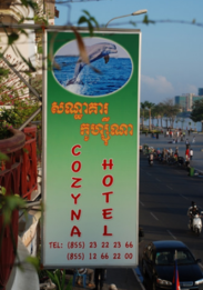 主页:http://www.cozyna-hotel.com/?page=home 地址:1A, Sisowath Quay, Phnom Penh, Cambodia 邮件:info@cozyna-hotel.com 电话:(855)23222366 and (855)12662200 【优点】: 1. 邮件回复快,一般能马上答复,最慢第二天肯定有回信。 2. 帮我们代买了“湄公快线”的车票,据说有的酒店会晃点客人或者借口没票而推荐其他公司的车。 3. 就在洞里萨河边大道上,我们的房间景观一流,早上可以看日出。 4. 步行至皇宫和博物馆5分钟时间,相当方便。 5. 距湄公快线的车站也不远,TUK-TUK车司机开价也就$2。 6. 酒店的服务很好,最后一天很热情地让我们免费寄行李、用卫生间。 本来还想在他们那洗个澡再去机场的,估计他们也不会反对,不过我们也只是想想罢了。 【不足】: 1. 客服的英文一般,和我半斤对八两啦,哈哈,不过交流绝对没问题。 2. 房间价格不算太实惠,我选的是他们第二贵的房型,有独立的阳台和卫生间。 他家最便宜的是没有窗的标间,$18一晚。最贵的是带浴缸的房间,$33一晚。 3. 房间的条件一般,装修没什么特色,房间也不大。我们的阳台房沿街,晚上还是有点吵的,但我和老公倒都没受影响睡得很好。 4. 没有免费接机,但是应我们的要求帮我们定了接机的Car,服务很好,但要$12, 大半夜的,就是花钱买个方便心安吧,老公的信