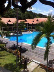 热浪岛有很多度假村,但据说Laguna性价比最高。反正我是觉得挺值!3D2N时间有点短,建议去的朋友可以加多1-2天,顺便还可以跳岛玩一下附近的停泊岛和浪中岛。这个是拉古娜的官网,有兴趣的同学可以看一下。中英文介绍都有。https://www.lagunaredang.com.my/ 我们去的时候人还不多,很快办理了入住。前台很多服务员都会中文,沟通起来倒是挺方便。房间离前台不是太远,沿着小径都是花花草草。中间还路过泳池。 园景房是背靠泳池一侧的房间,阳台对着的是码头方向,私密性比泳池方向的好些,也相对没那么吵。阳台经常有小松鼠来光顾,所以吃的一定要收好了! 房间挺不错,够宽敞! 房间出门就可以看到楼下的泳池。泳池还附带一个儿童池,可以带小朋友游泳。 酒店的餐厅就在大堂二楼,很大!菜式也很丰富!靠窗的位置还可以边吃边看海景! 我们每次去吃饭都比较早,所以早晚都坐在靠窗的位置。