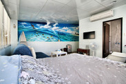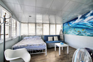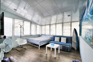 小房子 NTD1800/晚(特别推荐)。随着日程的延续,眼看怎么都不可避免的要赶上周末进驻台北了,想起高雄遭遇夜幕流浪街头一幕不免心有余悸。前夜在花莲就开始上网各种预订平台查询,不禁感叹台北大都市的房价那个肝儿颤啊,开价都是这一路以来每晚平均价格的两三倍。既然横竖都是一刀,顺其自然也就罢了,偏偏都是中间周六那晚已满无房。 继续转变思路:内事问百度,外事找谷歌,“台北 短租”就这么找到了『小房子』:其实,起先还沉浸在找房焦虑中的我并不是被文字所动,单是从那一张张房间的图片中,那不同的主题墙饰、那温馨的暖光、那松软的床和沙发、那杯具那厨灶……我倒是更加乐意用花酒店的钱来体验一下不一样的旅行,不同在不只是日落而归日升而出的一个房间一张床,但你又分明是一个游客的身份穿梭在这个陌生的繁华中。 马上联系到房子的主人Sandy,确认我需要的日期都有房间,价格也比较平和可以接受,“分配”的房间是信义馆的『仲夏艳沙滩』(与其说是分配,因为能很快敲定台北的住宿,我还完全没有从原先的焦虑,以及没有感观概念的台北地图中回过神来。台北捷运象山线信义安和站2号出口一分钟,左转右手边文昌街46号,我对自己的房间仅此信息)。 真正到达那天,对于顶层这间不仅是宽敞明亮的房间,并伴随整面墙彩绘的海浪、阳光、沙滩,床头吊饰和台子上各式精美的贝壳,以及摇椅和小船,我和我的小伙伴儿都惊呆了…… 『小房子』它既不像民宿,也不是旅舍,它也不可能让我真的就自此对台北温馨到家的归属,但它确实在瞬间拨动过我的心弦,当清晨和煦阳光穿过百叶窗的缝隙洒落于床头,我会暂时忘却自己是一个旅者而继续慵懒在床上,或错觉的以为窗外闹市的台北就是外婆的澎湖湾,它分明放慢了我在台北的节奏,在这都市里也带着一份从容和惬意……