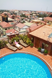 Okay Guesthouse Siem Reap,22美元 双人间,热水空调。之前预定看中的是屋顶游泳池。这家到酒店唯一让我觉得不错就是屋顶游泳池了。 室内的环境,真心一般。卫生间不是很大。垃圾桶也很小。洗澡的龙头还安的那么低。洗澡水还可以。最关键的是大家看到洗脸台没。上面的的玻璃安的很宽,下面的水台很小,洗脸的时候,脸都不知道放在什么地方,位置太不合理了。从上面看,玻璃台快占了2/3的位置了。我洗脸的时候,只好把脸放在玻璃台下面。要不然衣服全湿了,鞋子也会湿。一把梳子还要用线绑在那里,生怕住客拿走了。。 出关后,之前预定的酒店以为会来接机,但没有,因为看到Booking上评价说有接机,我才订的。而且我预订有留言,没回复。门口的接机司机可真多啊。就是和我两没关系。干脆自己打tutu吧。这时候有个司机主动问我们,我们谈了半天价格,5美元送到酒店。主要是这的空闲司机不多,来的司机都是接人的。几乎没有拉散客的。 到酒店后,其中一个会说中文。我们办理入住后,他让我们提前付房费。房间在一层。空间还是有大的。天花板还挺高。就是被子有点旧,上面还有个窟窿。预订的时候便宜不含早餐。
