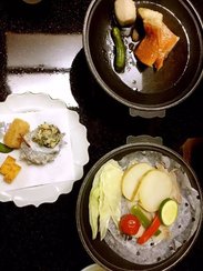 这次选的温泉酒店也是Dear Sister中深泽一家、小八和店长去过的水叶亭。这家温泉酒店是和式房,晚餐是送到房间的会席料理,一人11000多日元,性价比高。温泉酒店的会席料理虽然看上去一小碟一小碟的量很少,但是绝对吃撑了好嘛。尤其是他家的刺身,这个份量绝对对得起这个价格。晚上去泡温泉的除了我们就是日本欧巴桑了,温泉池子人也少,不过这个天气泡温泉和蒸桑拿没有什么区别哈哈哈。