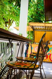 老板是一眼望穿的浪客形象,墨镜不摘,一头乱发横立,黝黑肌肉的两臂,不怎么说话,点头来示意。带着苍茫黑道大哥的即视感,他倚着门框像我们问好,然后示意空房随意参观。大哥是个摄影师,民宿满墙贴的都是他的摄影大作。光影迷离,色彩鲜艳,也许你不那么懂摄影,但足够看出那一张张照片后的新意。这年头靠摄影养家糊口的人估计不多了,在泰国就更稀疏了,于是大哥挽起袖子开了一家民宿,交朋友,搞摄影,浇花,打咖啡,浪客的生活从此闲适下来。24号画廊不是那种奢华享受的地方,更适合爱摄影的年轻人,背包客来玩耍。这里位置很好,在古城中央,一晚房价不到100人民币,还有小暗房一间,没事的时候可以和大哥谈谈人生谈谈梦想。