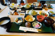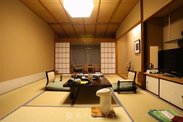 如日本其他的温泉乡一样,这一家从JR站下来还有半小时的车程,幸好酒店贴心地安排了接驳车往来于车站和酒店之间。从大堂的落地玻璃窗里望到了一楼枯山水风格的庭院和背后的远山,已让我彻底爱上了这家酒店。而点着篝火的无人庭院在这迷蒙的夜晚显得更为迷人。一个会讲一点英文的女孩一路引着我们去房间。和那些高档的温泉酒店一样,这家也提供了各种花色的浴衣和腰带