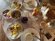 民宿没有任何标志,没有门铃。大米透过玻璃窗瞧了瞧,空无一人。一拧门把,开了!走进屋内,开了几个门,看不到人。电话给房东。房东让她们等几分钟。过了会,一位白发苍苍的老奶奶出现了。她带到二楼的房间,熟练地用手机谷歌翻译介绍屋内的设施。她对着手机说俄文,转换成普通话播放。老奶奶人很和善,常带着亲切的笑容。才明白,网页上说的通晓中英文的前台是老奶奶的手机翻译。 老奶奶在楼上客厅摆了四五桌,为住客准备了丰盛的早餐:有面包、泡芙、土豆、煎蛋火腿、麦片粥、各式饮料、苹果等等。苹果味道不错。可能是她自己种的。